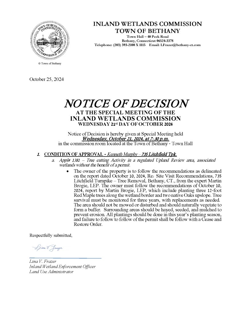 10/30/2024 - Notice of Decision - Inland Wetlands 10/21/2024
